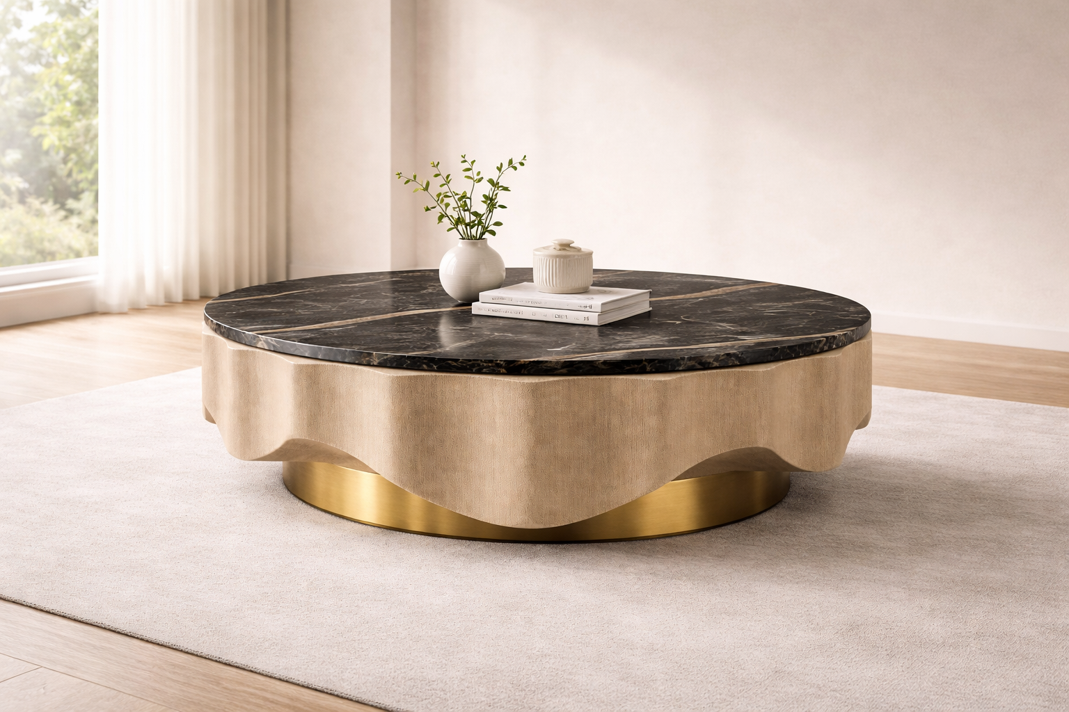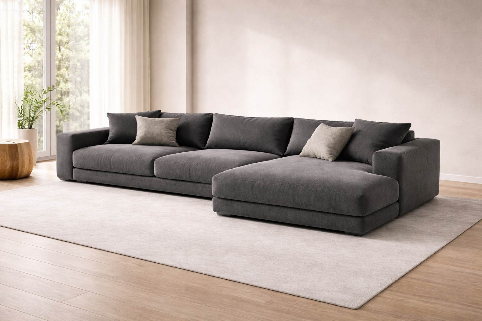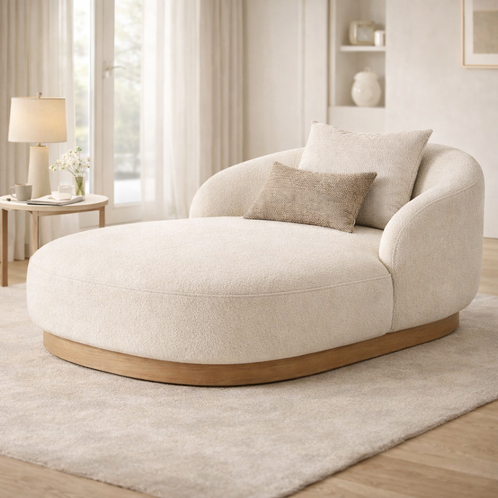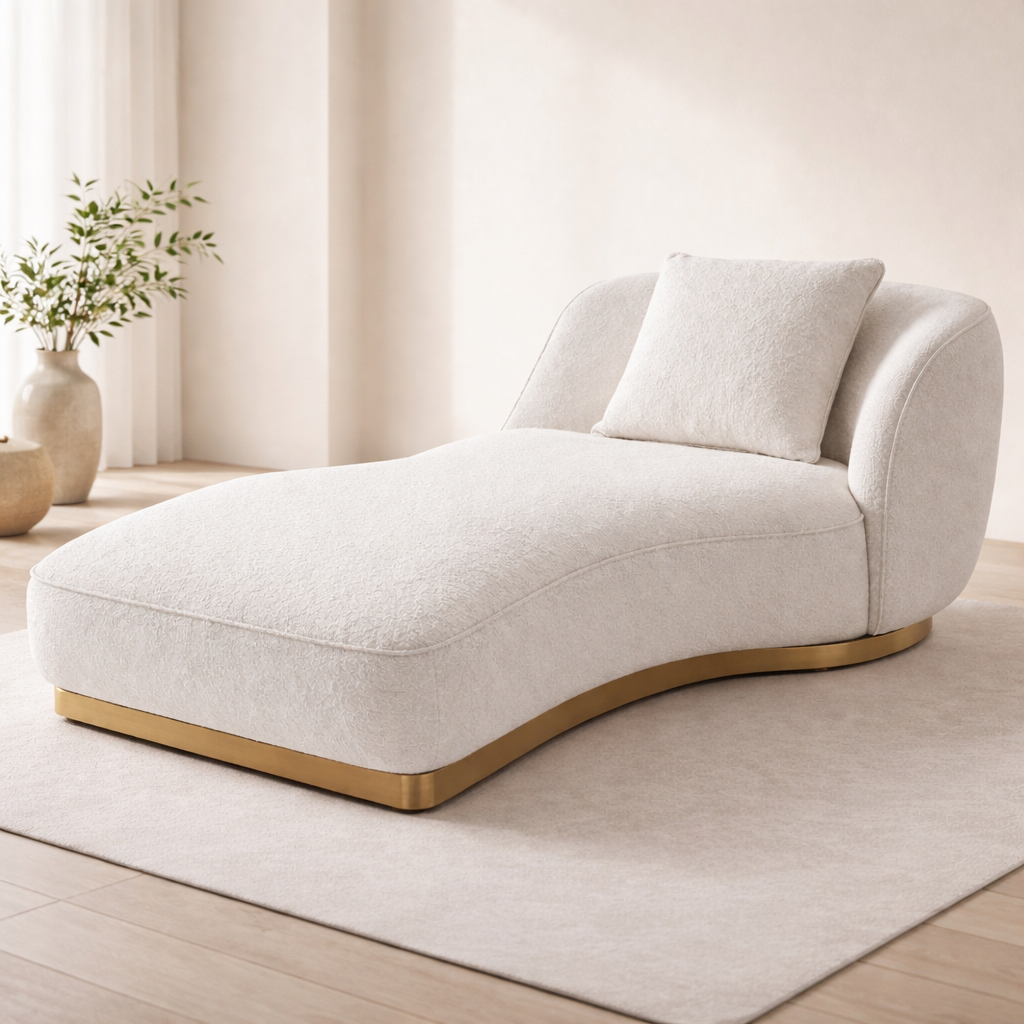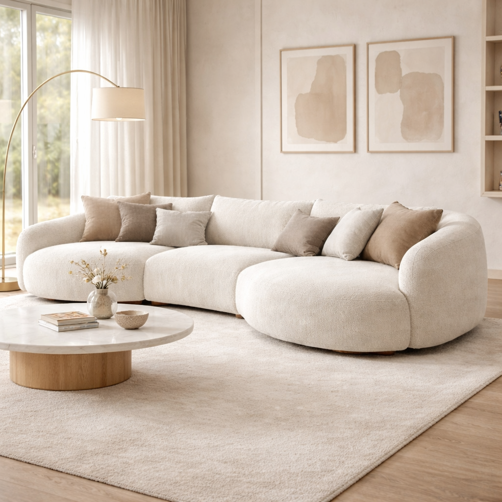 Modern curved sectional sofa with a soft bouclé texture and neutral beige tone. Features plush cushions, ergonomic design, and a sturdy base, perfect for creating a cozy, elegant living space.