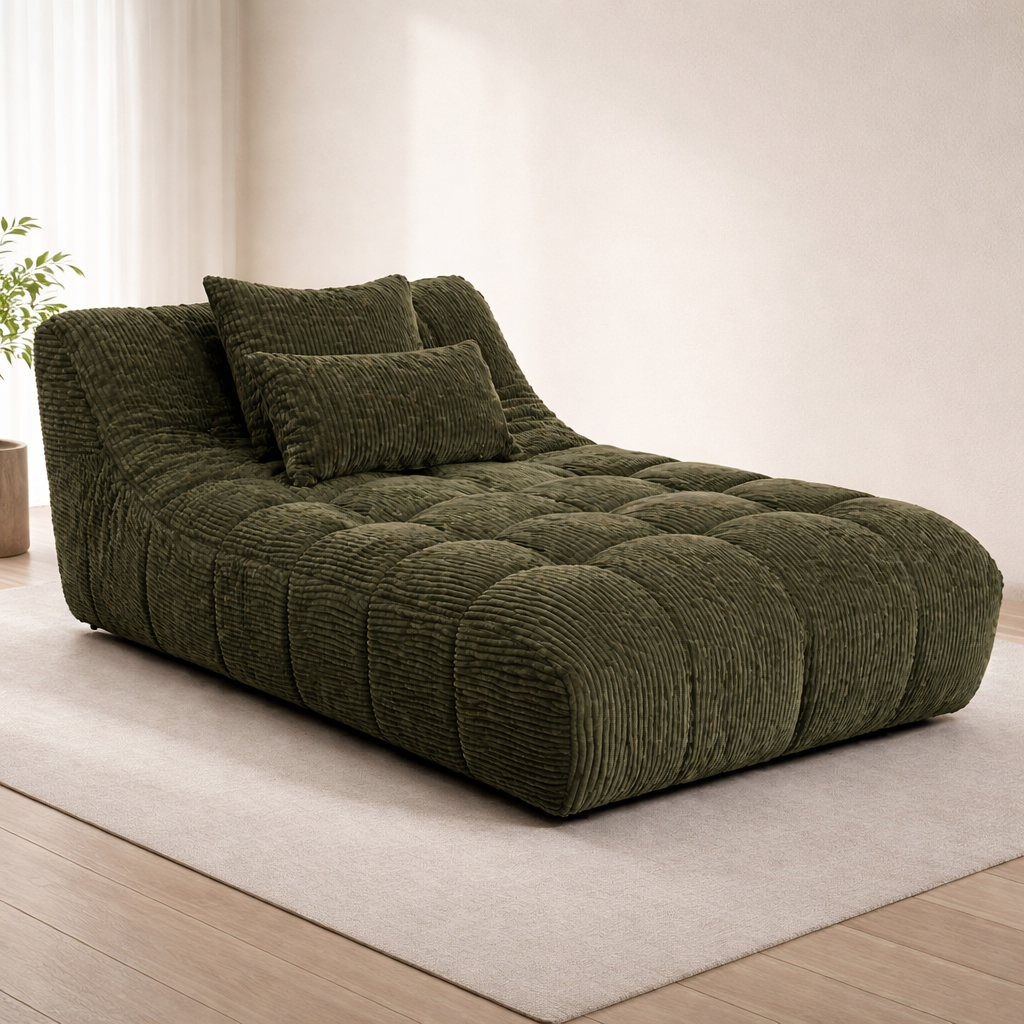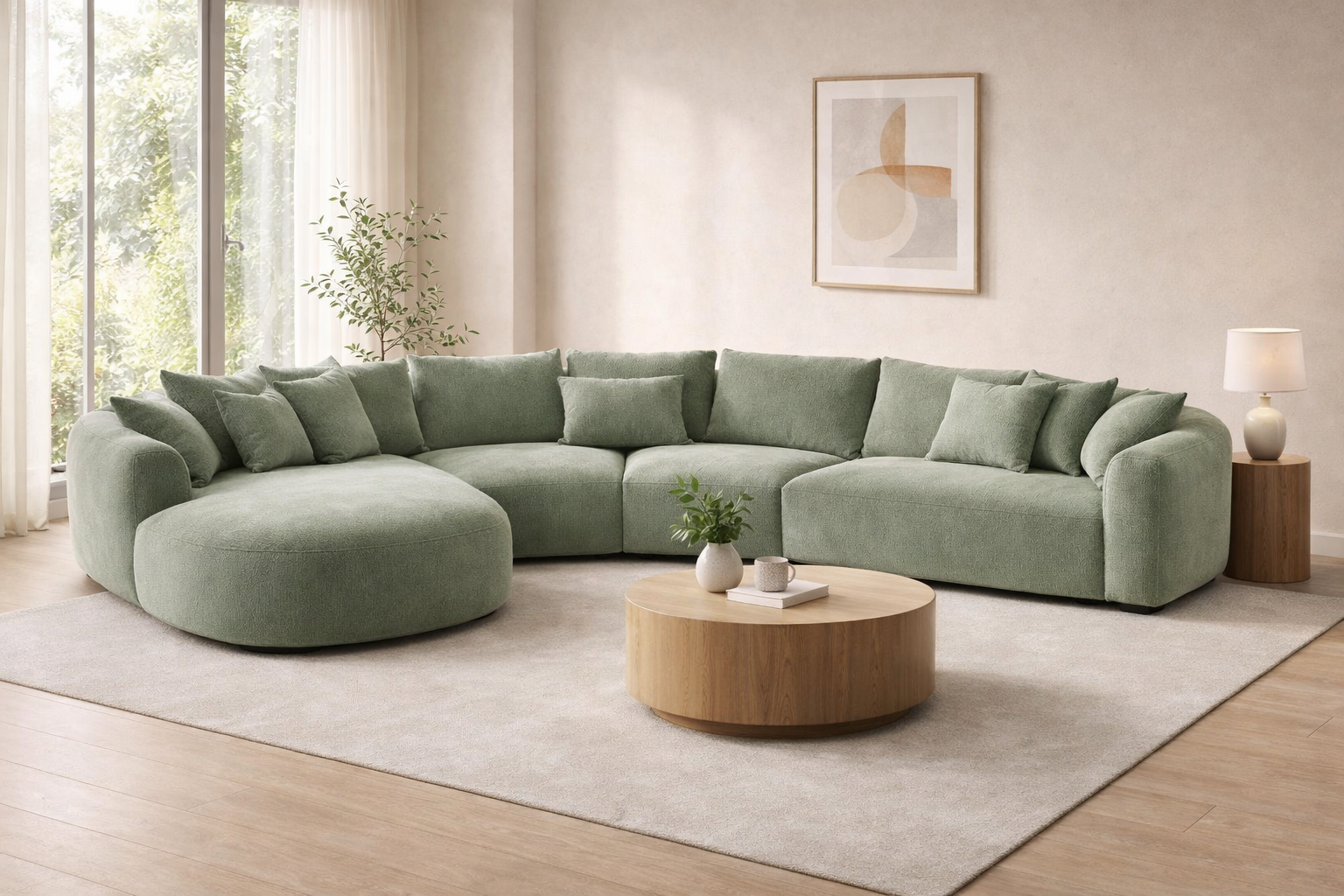 Modern curved sectional sofa in soft sage fabric, featuring plush cushions, spacious seating, and a cozy, elegant design perfect for contemporary living spaces.